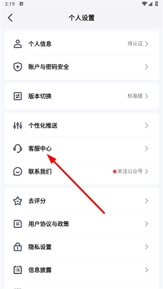 3、在個人設(shè)置頁面,點擊客服中心選項,進入客服中心頁面。