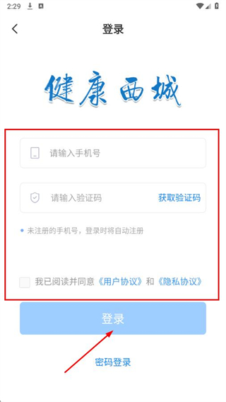 2、在登錄頁(yè)面,輸入手機(jī)號(hào)碼、驗(yàn)證碼,勾選用戶協(xié)議,點(diǎn)擊登錄,未注冊(cè)的手機(jī)號(hào)將自動(dòng)注冊(cè)。