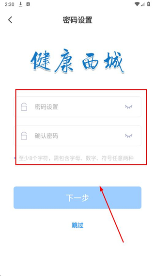 3、在密碼設(shè)置頁(yè)面,設(shè)置密碼,再次確認(rèn)密碼后,點(diǎn)擊下一步。