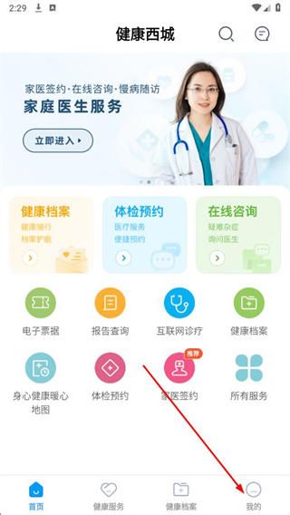1、打開健康西城APP,點(diǎn)擊導(dǎo)航欄中的我的。