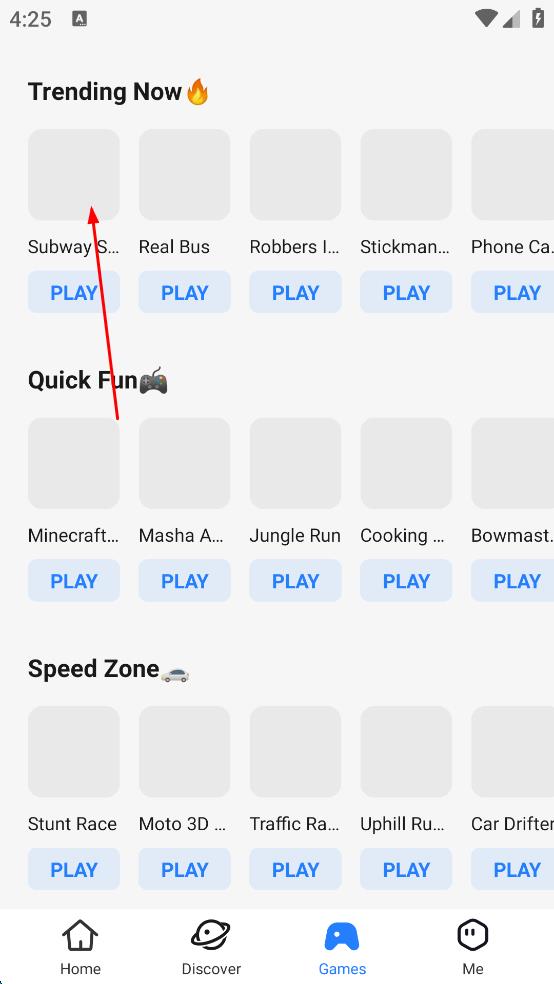 3、在游戲頁面,可看到“Trending Now”“Quick Fun”等不同分類的游戲,選擇感興趣的游戲,點(diǎn)擊進(jìn)入游戲詳情或游玩頁面。