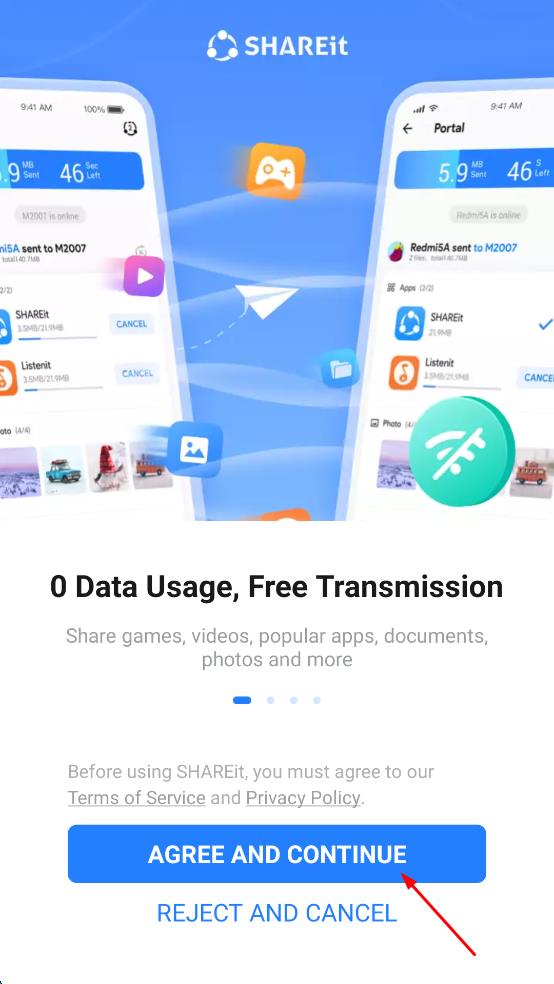 1、打開SHAREit應(yīng)用,在提示頁面點(diǎn)擊“AGREE AND CONTINUE”按鈕,同意服務(wù)條款和隱私政策,進(jìn)入應(yīng)用主界面。