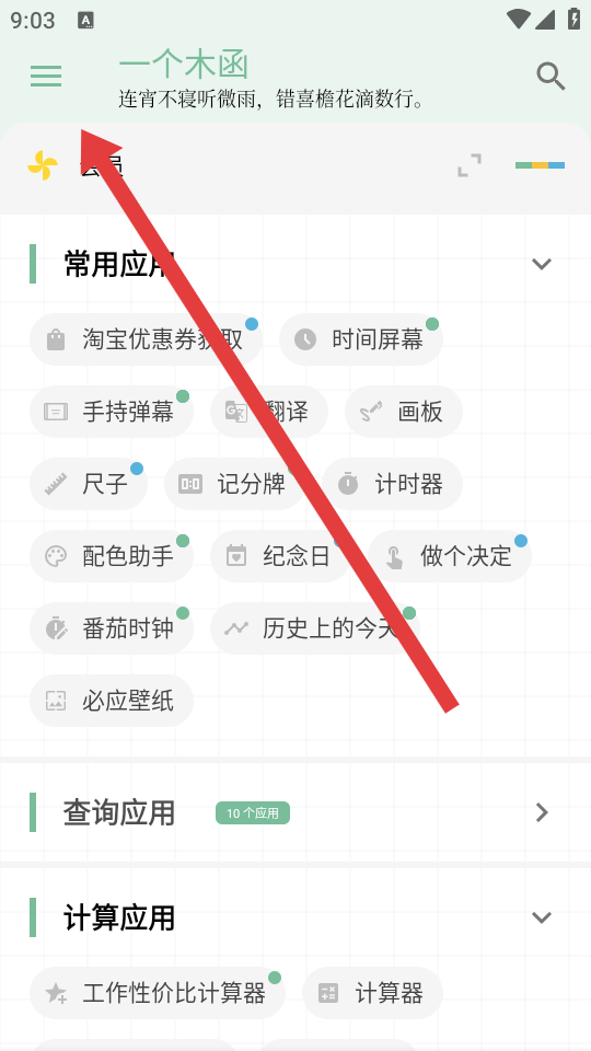 1、打開一個木函APP,需要點擊左上角的三條橫線菜單按鈕,展開側邊欄。