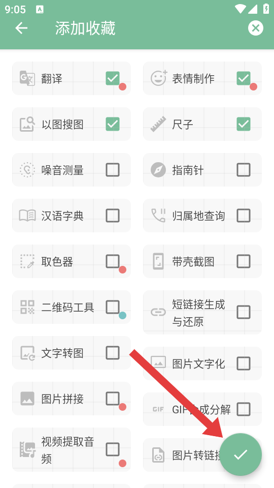 4、在添加收藏界面,勾選想要添加的小組件,然后點擊右下角的對勾按鈕,完成小組件的添加操作。