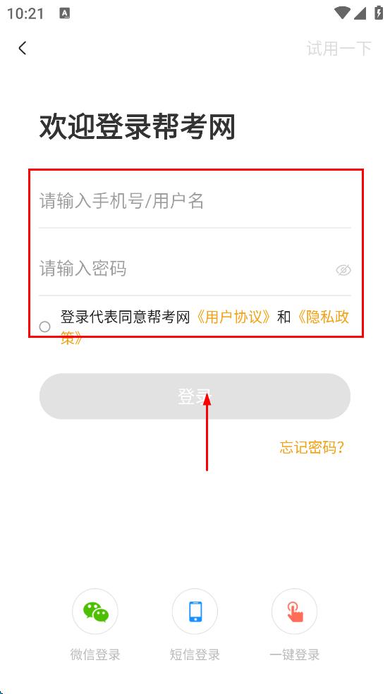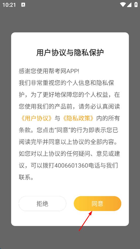 1、打開(kāi)幫考網(wǎng)APP,出現(xiàn)用戶協(xié)議與隱私保護(hù)頁(yè)面,仔細(xì)查看后點(diǎn)擊“同意”按鈕。