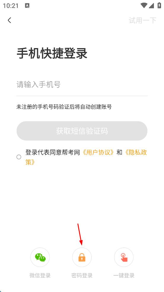 3、在手機(jī)快捷登錄頁(yè)面,點(diǎn)擊“密碼登錄”選項(xiàng),進(jìn)入密碼登錄界面。
