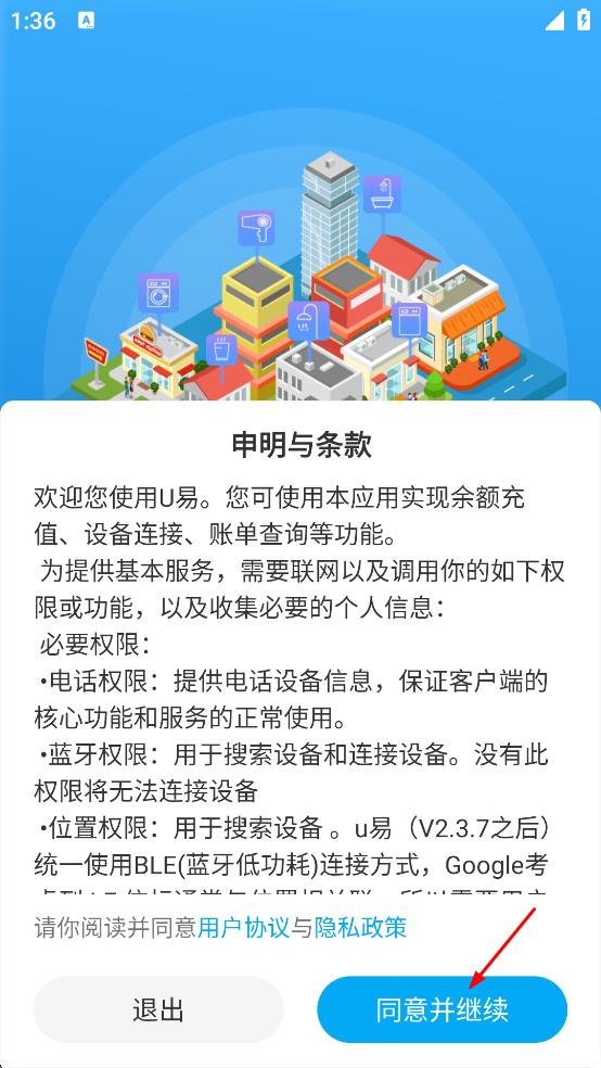 1、打開U易APP,出現(xiàn)申明與條款界面,仔細閱讀后點擊“同意并繼續(xù)”,進入登錄選擇頁面。