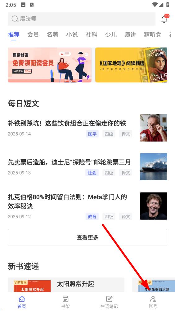 1、打開每日英語閱讀app,點(diǎn)擊底部導(dǎo)航欄最右側(cè)的賬號(hào)圖標(biāo),進(jìn)入個(gè)人相關(guān)界面。