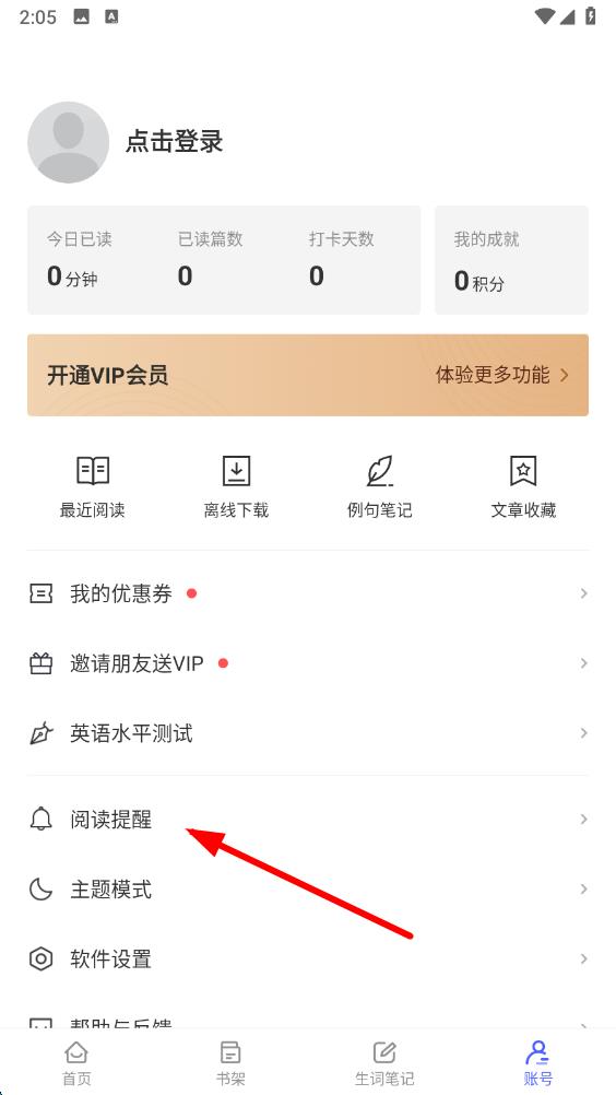 2、在個(gè)人界面中,找到并點(diǎn)擊閱讀提醒選項(xiàng),進(jìn)入閱讀提醒設(shè)置頁面。