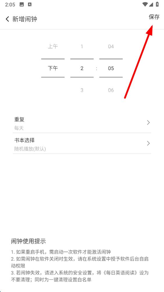 4、在新增鬧鐘頁面,設(shè)置好提醒時(shí)間,選擇提醒重復(fù)的頻率,完成后點(diǎn)擊右上角的保存,即可成功設(shè)置閱讀提醒功能。