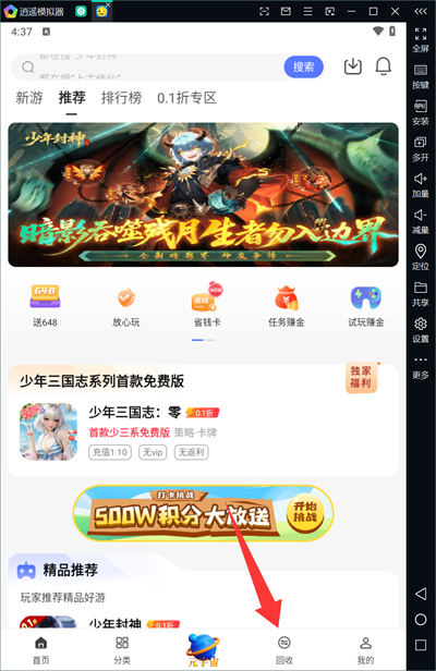1、進入游戲盒子后,在首頁的位置可以看到許多熱門的游戲資源,點擊下方的【回收】功能;