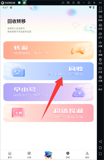 2、點擊后進入回收轉(zhuǎn)移功能界面,在這里找到【回收】選項并點擊;