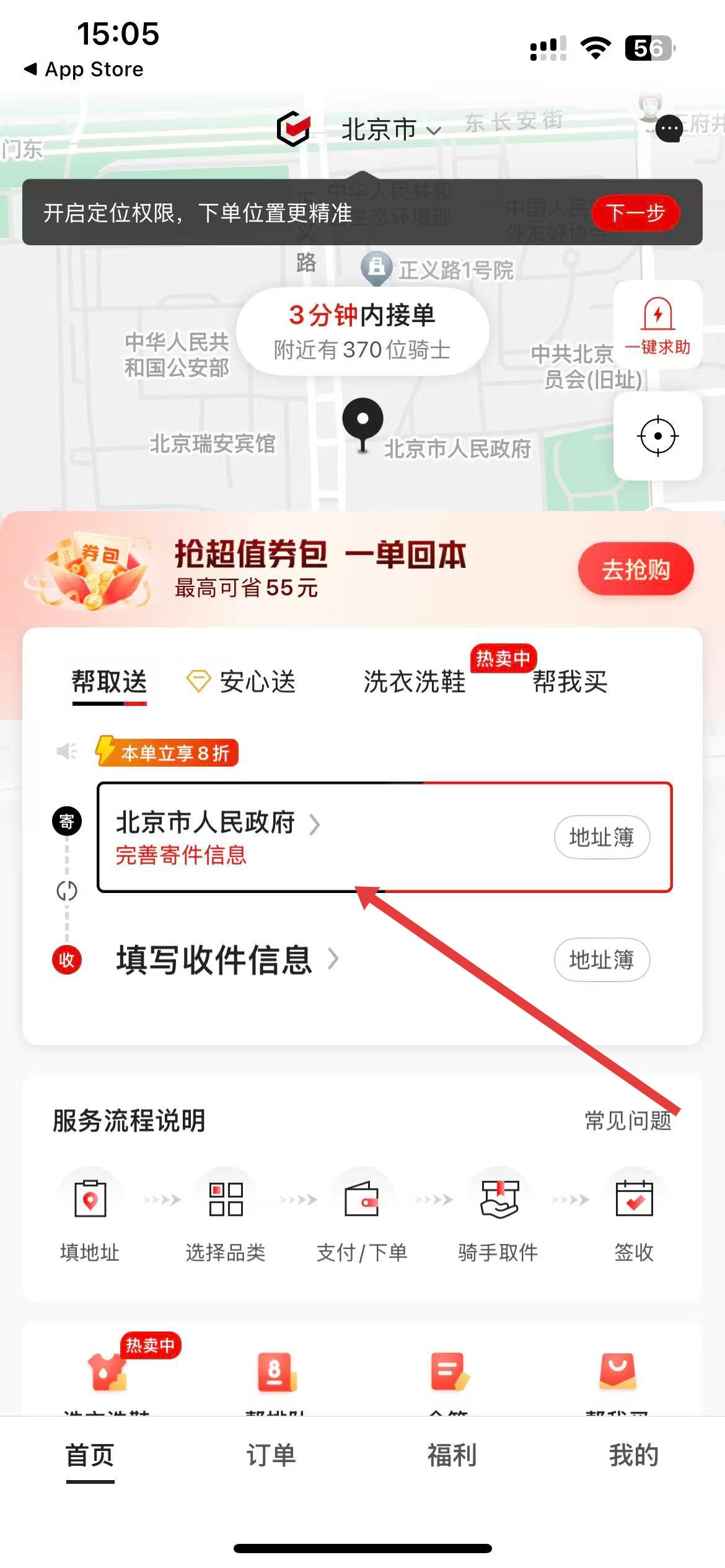 1、打開順豐同城app,在首頁確認所在城市,選擇幫取送等服務(wù)類型后,點擊完善寄件信息,填寫寄件人和收件人相關(guān)信息。