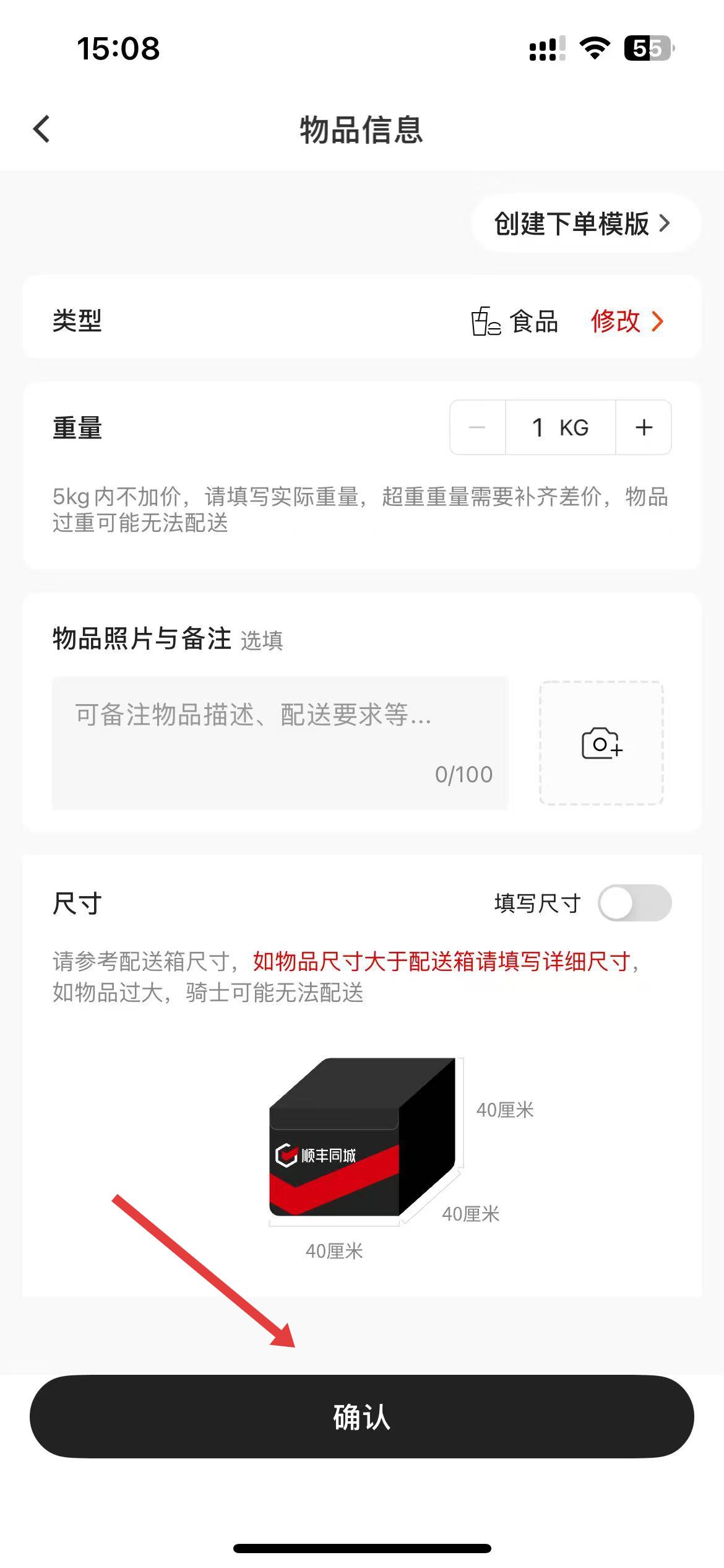 2、進入物品信息頁面,選擇或修改物品類型,準確填寫物品重量,還可以按需填寫物品尺寸,確認信息無誤后,點擊確認按鈕。