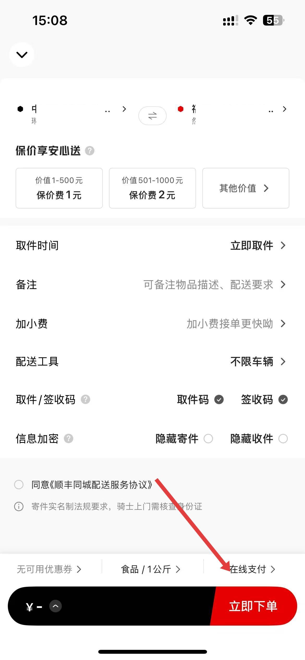 3、在訂單確認頁面,核對寄件和收件信息,選擇保價、取件時間等增值服務(wù)及相關(guān)選項,選擇在線支付方式,最后點擊立即下單。