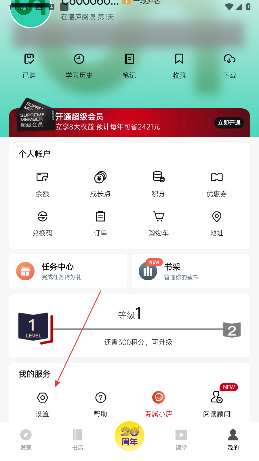 1、打開(kāi)湛廬閱讀APP,在個(gè)人頁(yè)面中,找到并點(diǎn)擊設(shè)置選項(xiàng),進(jìn)入設(shè)置界面。