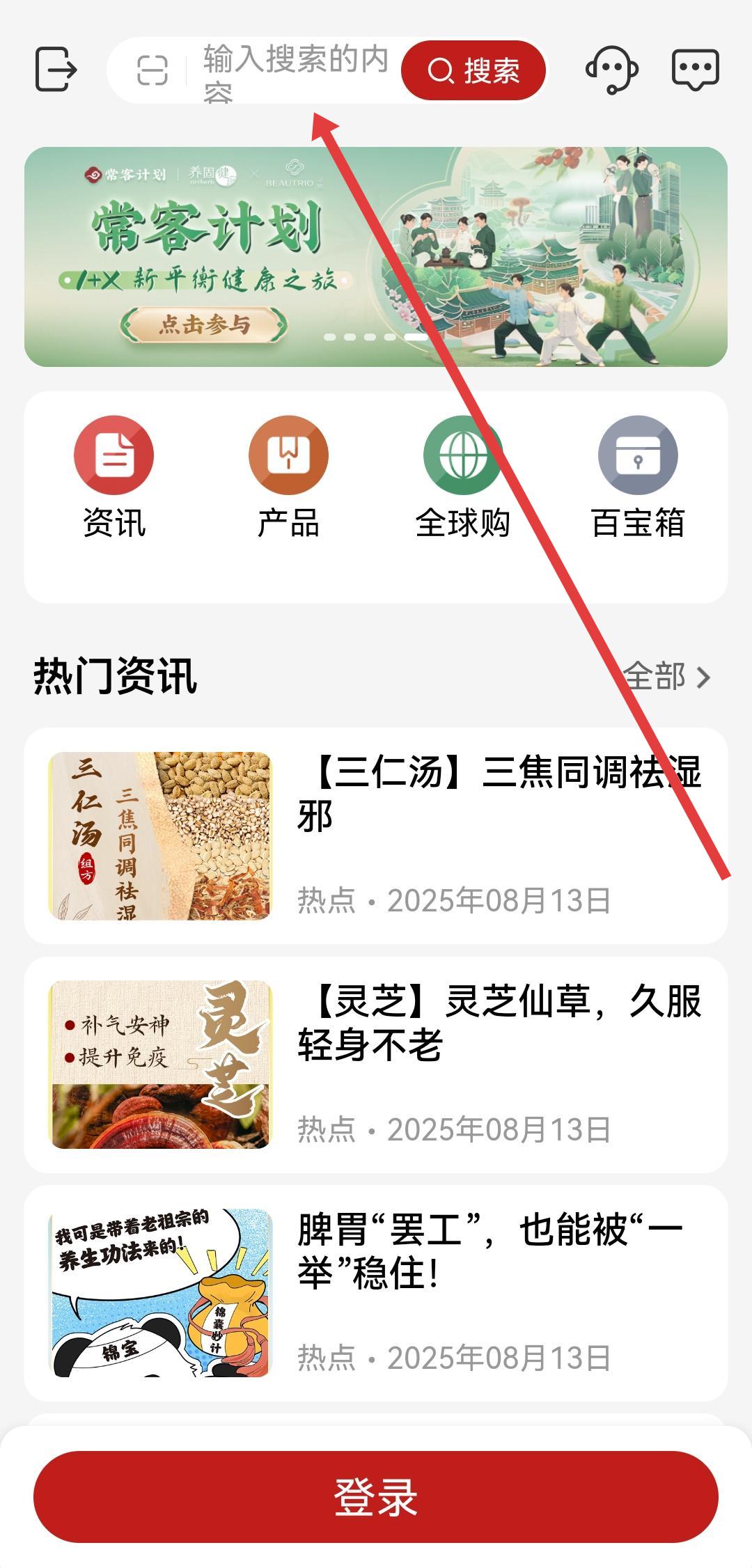 1、進(jìn)入無限極最新版APP的首頁,點擊頂部搜索欄,跳轉(zhuǎn)至搜索界面,可以查找資訊、產(chǎn)品等內(nèi)容。
