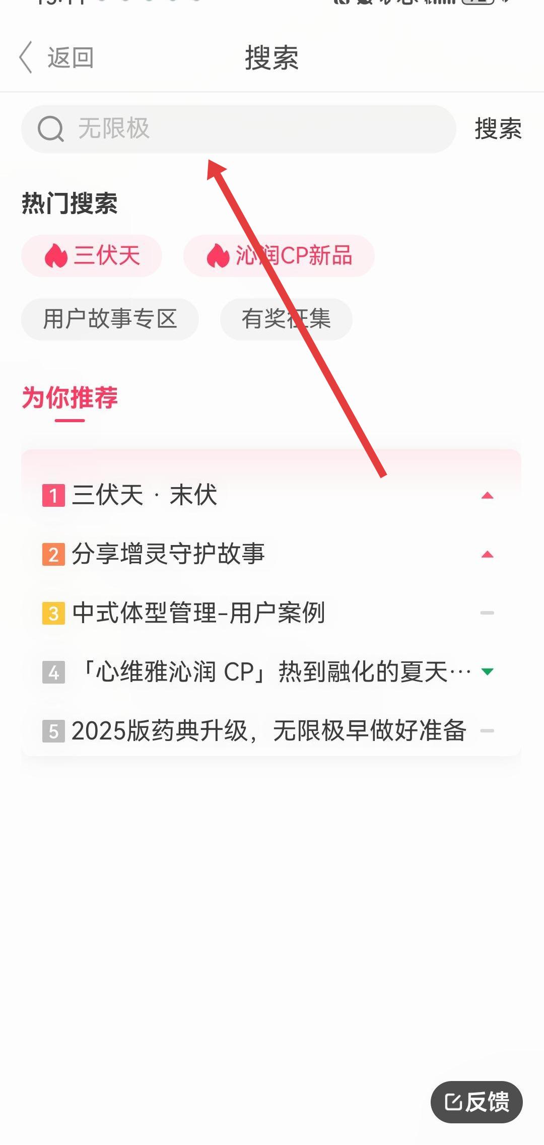 2、在搜索頁面,需要點擊搜索框,輸入關(guān)鍵詞如三伏天、無限極等,可以選擇檢索相關(guān)資訊或產(chǎn)品信息。