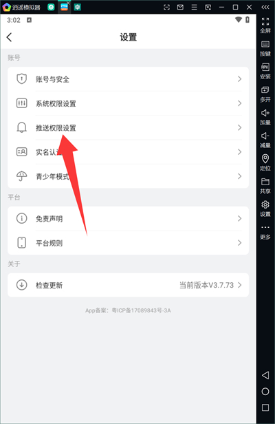 3、在設(shè)置功能界面找到【推送權(quán)限設(shè)置】選項(xiàng)并點(diǎn)擊;