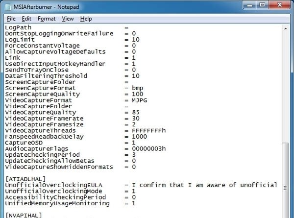 7.喜歡沖擊極限的朋友們碰到這種頻率上限肯定很不爽吧,接下來講告訴大家一個方法來解開這種束縛,首先在AfterBurner的安裝目錄下,找到MSIAfterBurner.cfg配置文件,用文本編輯軟件打開,定位到[ATIADLHAL]一項,下面的“unofficialoverclockingEULA=”原本是空白,在這里我們輸入:I confirm that I am aware of unofficial overclocking limitations and fully understand that MSI will not provide me any support on it。