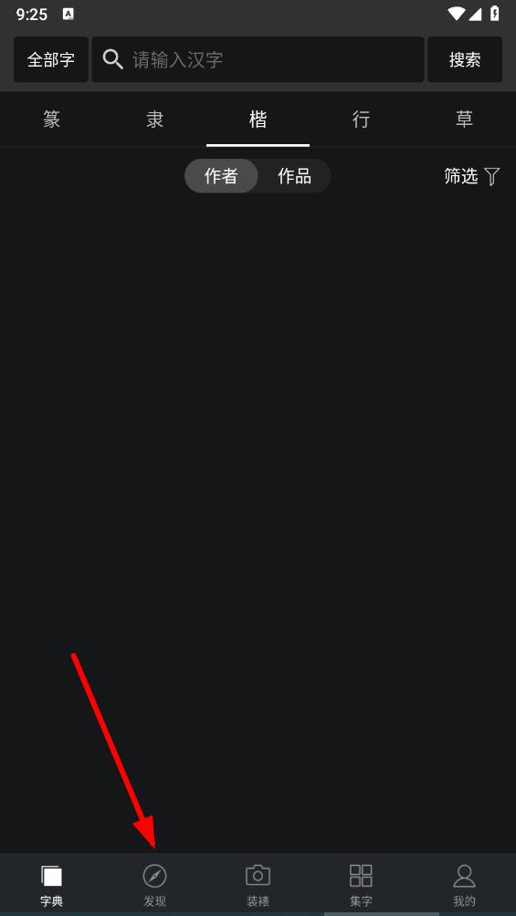 1、打開書法字典大全app,點(diǎn)擊底部導(dǎo)航欄中的發(fā)現(xiàn)選項(xiàng),進(jìn)入發(fā)現(xiàn)頁(yè)面。