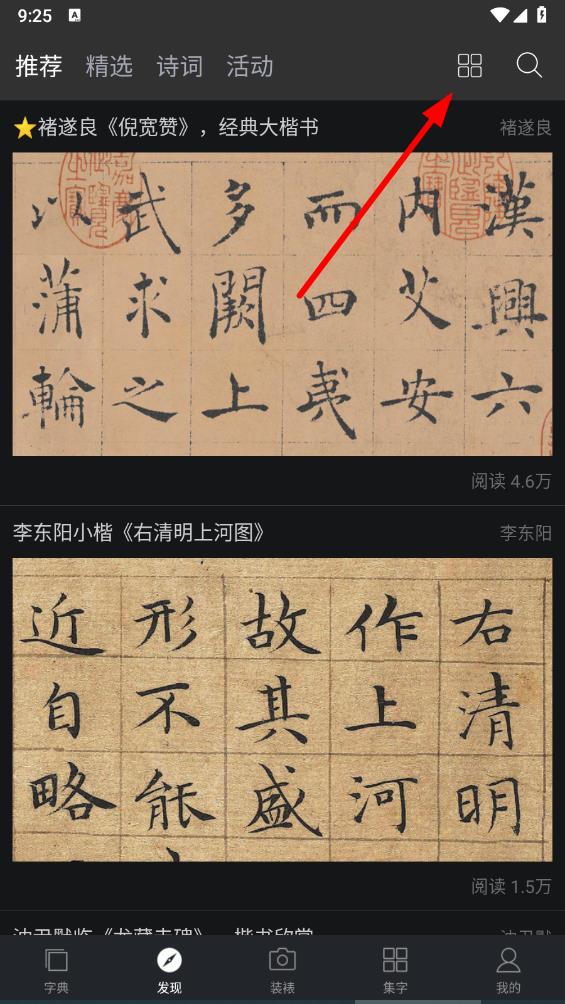 2、在發(fā)現(xiàn)頁(yè)面的右上角,點(diǎn)擊箭頭指示的圖標(biāo),進(jìn)入書法家搜索界面。