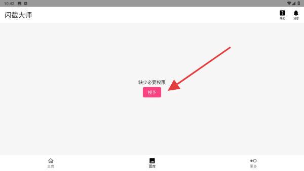 1、打開閃截大師APP,若界面顯示缺少必要權(quán)限,點(diǎn)擊頁面中間的授予按鈕。