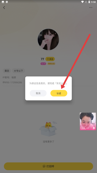 3、在出現(xiàn)的彈窗中點(diǎn)擊認(rèn)證按鈕,進(jìn)行實(shí)名認(rèn)證后開始打招呼。