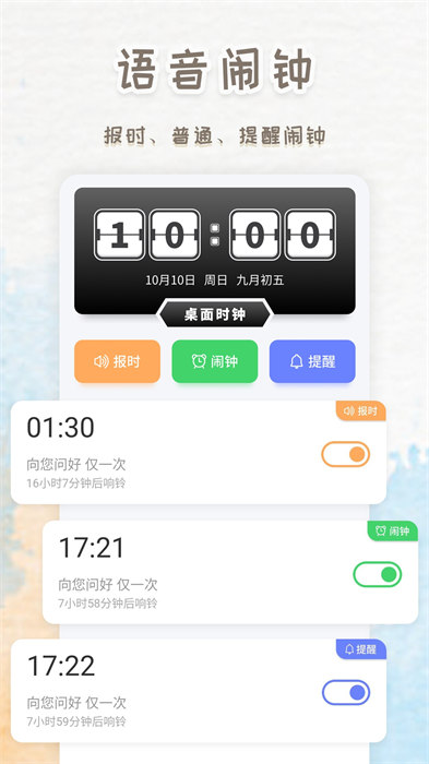 語音播報(bào)鬧鐘是一款簡(jiǎn)單易用的語音報(bào)時(shí)鬧鐘。