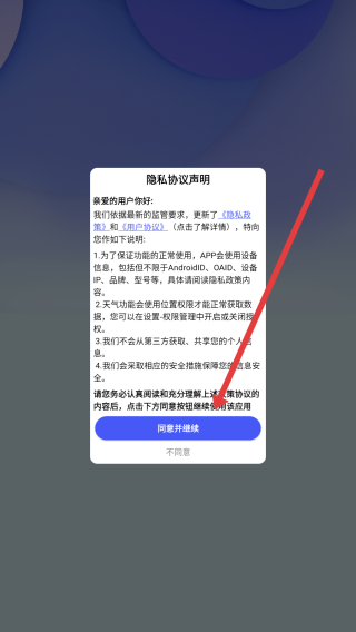 1、打開萬能空調(diào)遙控器App,在隱私協(xié)議說明彈窗點擊同意并繼續(xù),接受協(xié)議進入應用主界面。