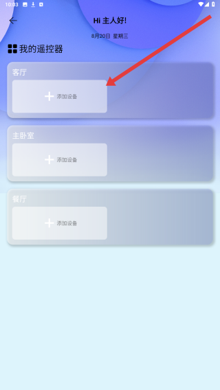 3、在我的遙控器頁面,可以點擊客廳板塊的添加設備按鈕,開始添加客廳的智能設備。