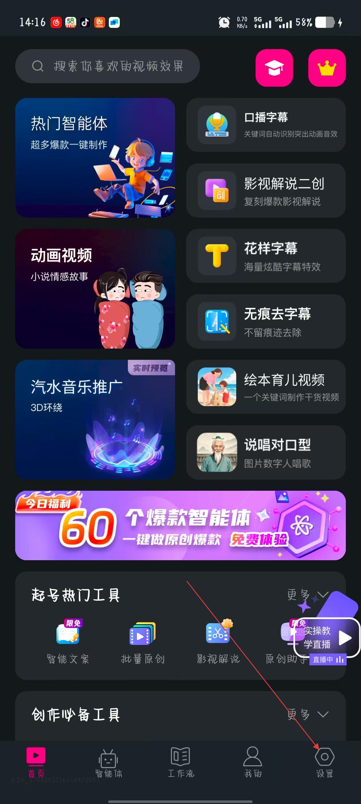 1、打開美冊視頻制作APP,進入首頁后,點擊界面右下角的設置圖標,進入設置頁面。