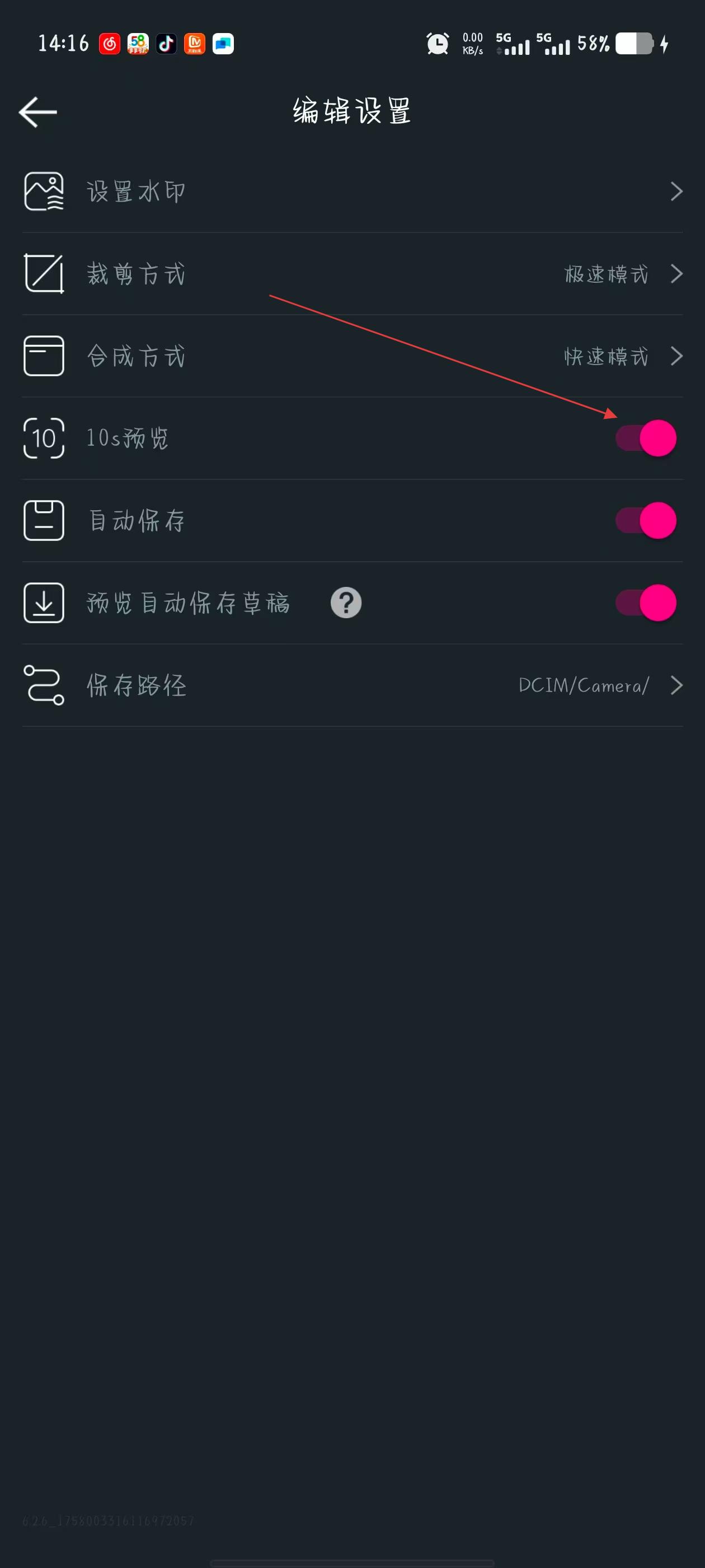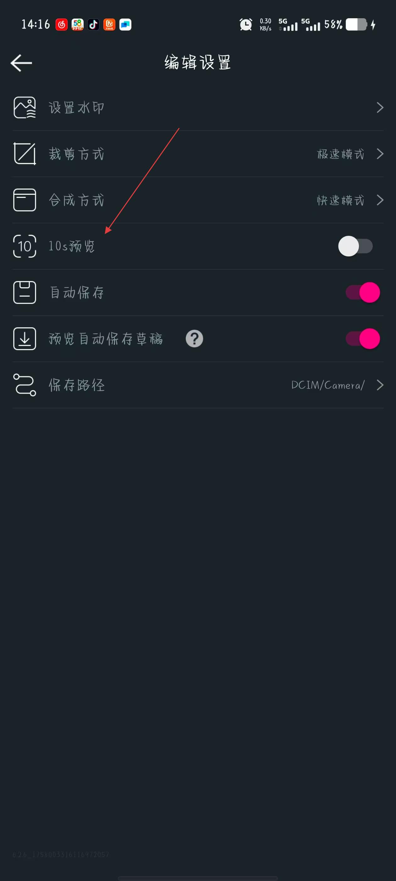 3、在編輯設置界面里,找到10s預覽功能對應的開關按鈕。