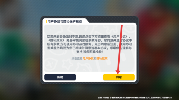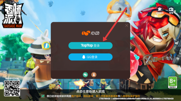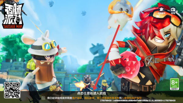 1、進入香腸派對啟動界面,點擊屏幕任意空白處,觸發(fā)用戶協(xié)議彈窗,開啟游戲登錄前的協(xié)議確認流程。
