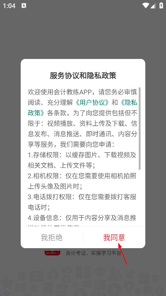 1、打開會計教練APP,在彈出的服務協(xié)議和隱私政策提示框中,點擊我同意按鈕。