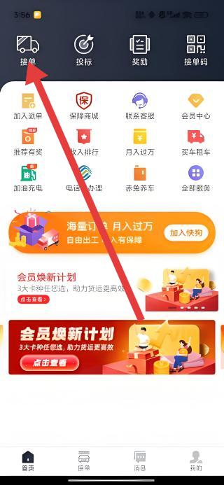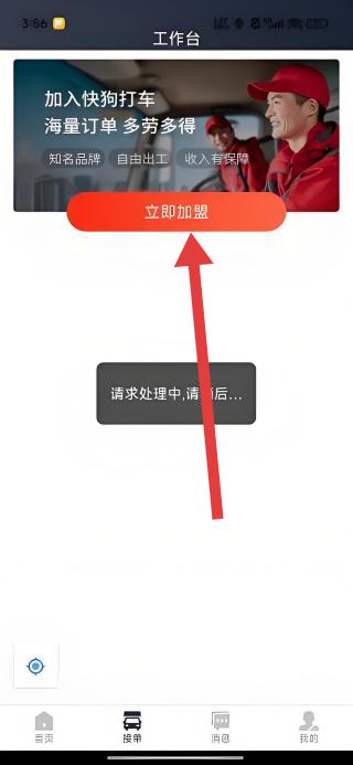 1、在快狗打車司機版首頁,點擊左上角接單圖標(biāo),進入工作臺頁面,查看接單與加盟相關(guān)入口。