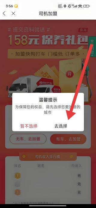 3、彈出溫馨提示彈窗后,可以點擊去選擇按鈕,挑選擬加盟的城市,推進司機加盟操作后開始接單。