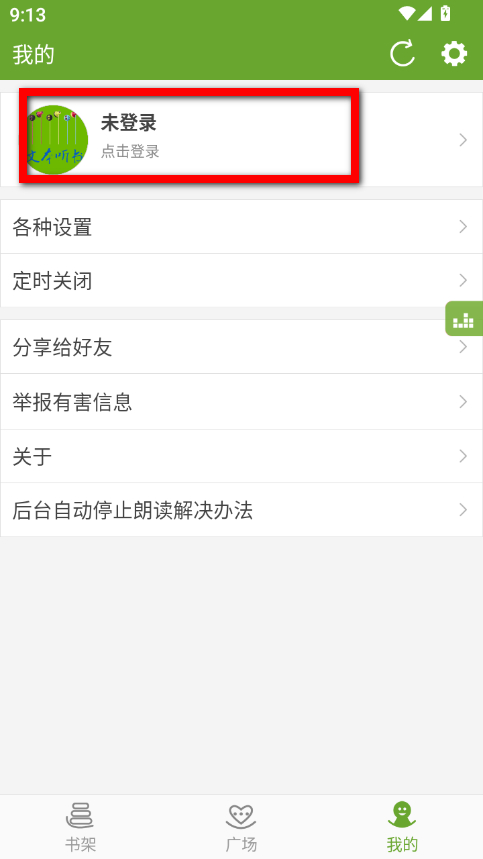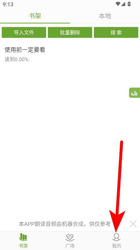 1、在txt文本聽書書架頁面,點(diǎn)擊右下角我的選項(xiàng),進(jìn)入個(gè)人界面。