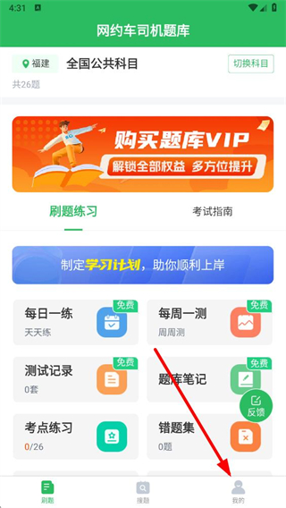 1、打開(kāi)網(wǎng)約車(chē)司機(jī)題庫(kù)app,點(diǎn)擊底部導(dǎo)航欄中的我的選項(xiàng),進(jìn)入個(gè)人相關(guān)頁(yè)面。