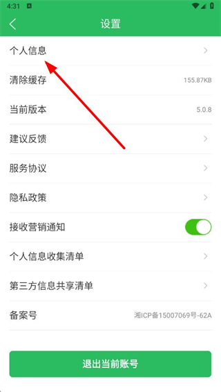 3、在設(shè)置界面里,找到并點(diǎn)擊個(gè)人信息選項(xiàng),進(jìn)入賬號(hào)信息頁(yè)面。