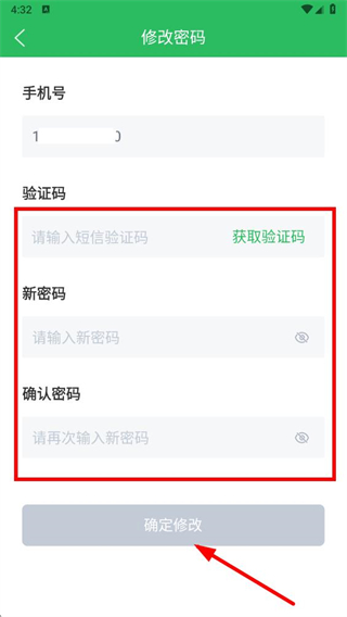 5、在修改密碼頁(yè)面,輸入手機(jī)號(hào),獲取驗(yàn)證碼,輸入新密碼再次確認(rèn)密碼,最后點(diǎn)擊確定修改按鈕,完成密碼修改。