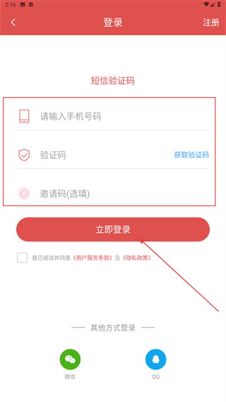 4、進(jìn)入登錄的界面內(nèi),輸入登錄的手機(jī)號(hào)、驗(yàn)證碼以及邀請(qǐng)碼,再點(diǎn)擊立即登錄即可。