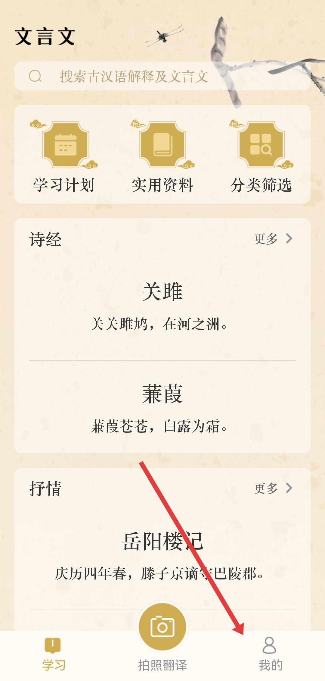 1、在文言文APP學(xué)習(xí)頁面,點擊右下角我的,進入個人的頁面。