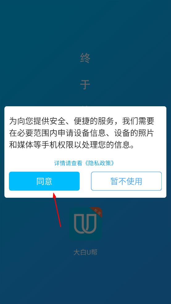 1、打開大白U幫軟件,會彈出權(quán)限申請?zhí)崾究?,為了能享受安全、便捷的服?wù),點擊“同意”按鈕,進入登錄界面。