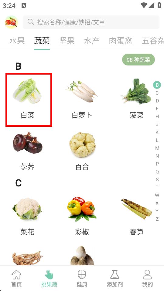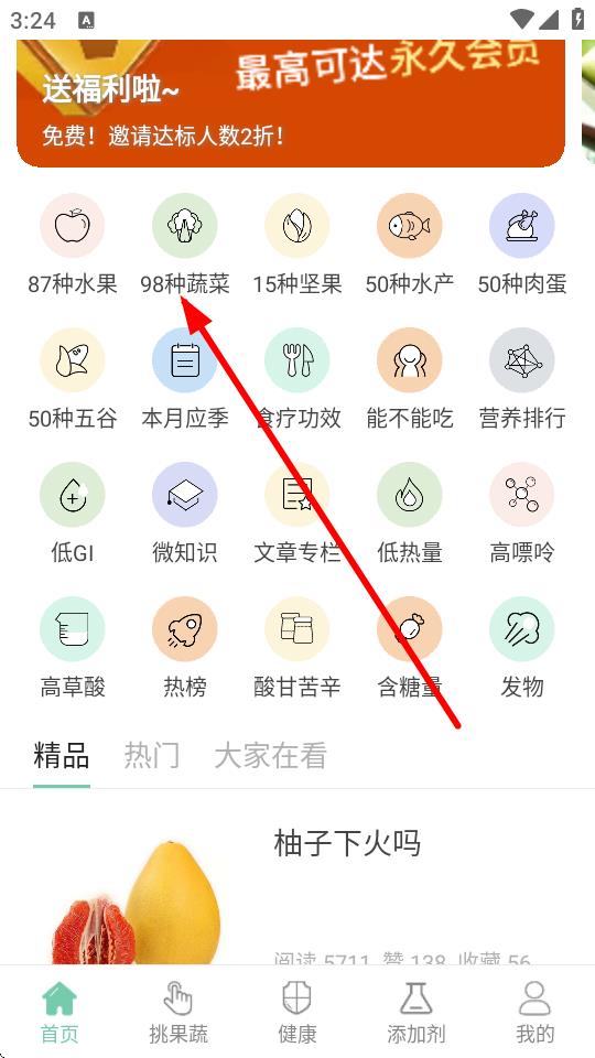 2、在首頁(yè)中點(diǎn)擊98種蔬菜,或者根據(jù)要挑選的產(chǎn)品類別,點(diǎn)擊87種水果、15種堅(jiān)果等對(duì)應(yīng)類別。
