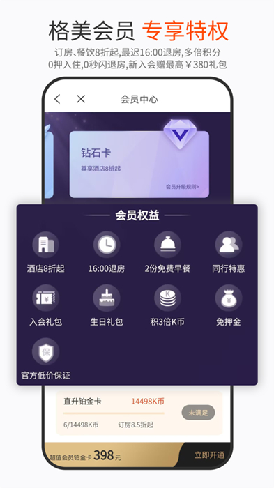 (1)方便快捷:附近酒店查詢、常住/收藏酒店、休閑房預(yù)訂、自助入住、會員中心;