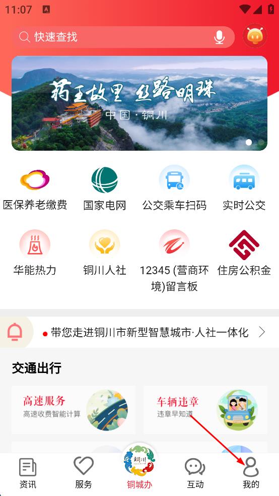 1、打開銅川城市服務(wù)類APP,進(jìn)入首頁后,點(diǎn)擊頁面右下角“我的”選項(xiàng),進(jìn)入個(gè)人中心頁面。