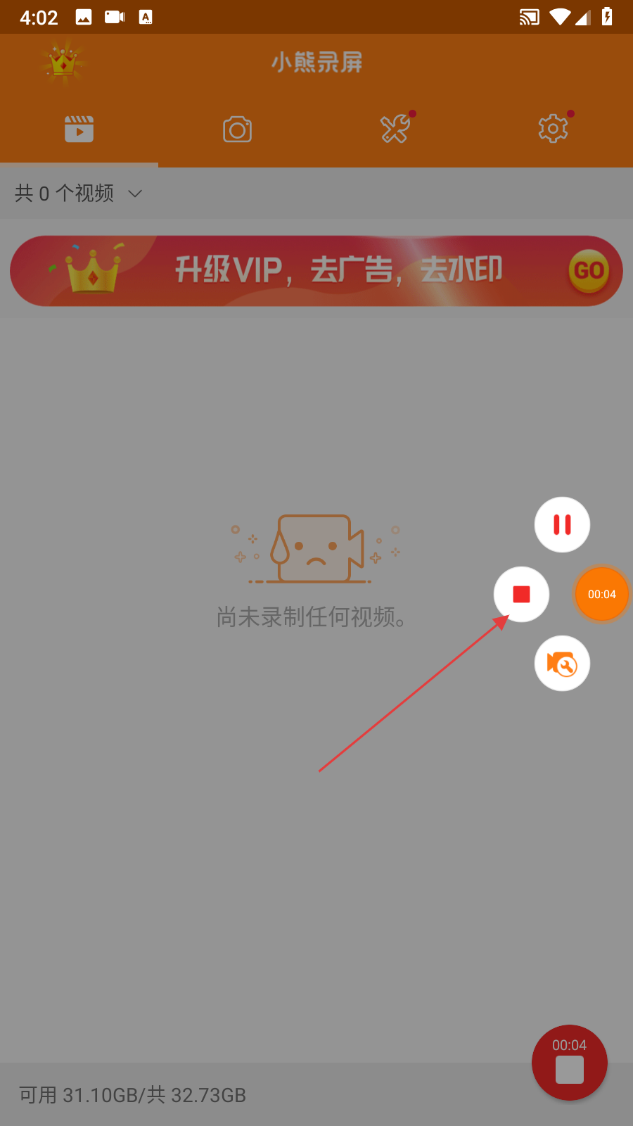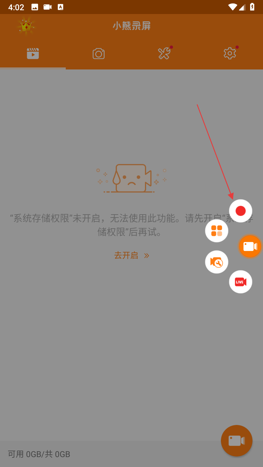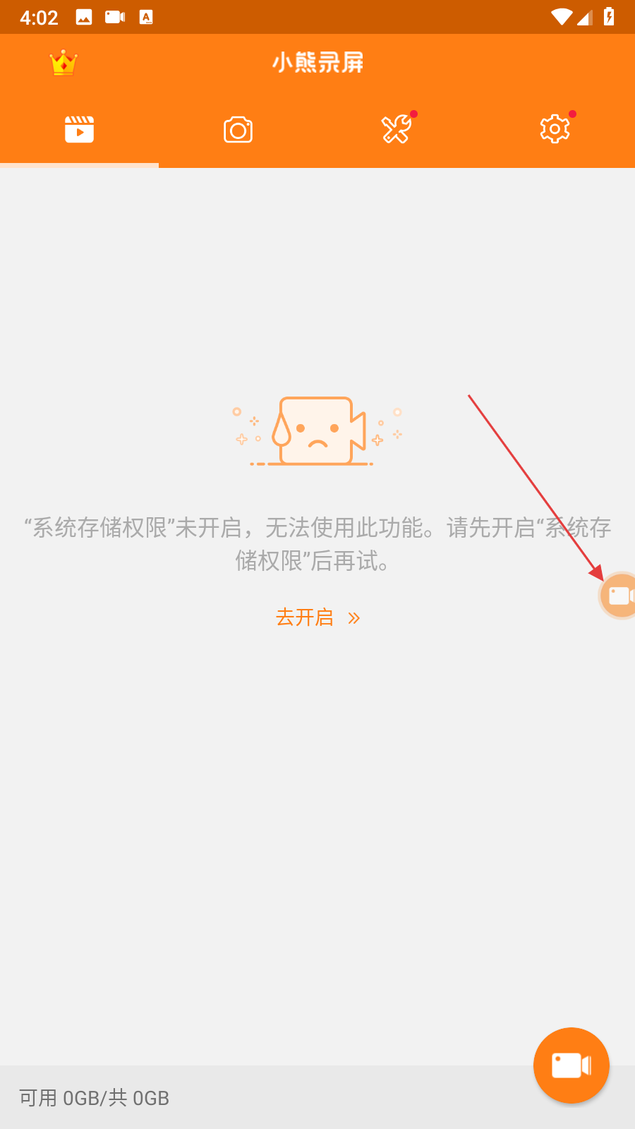 1、打開小熊錄屏應(yīng)用,點(diǎn)擊右邊隱藏著的橙色攝像機(jī)圖標(biāo)。