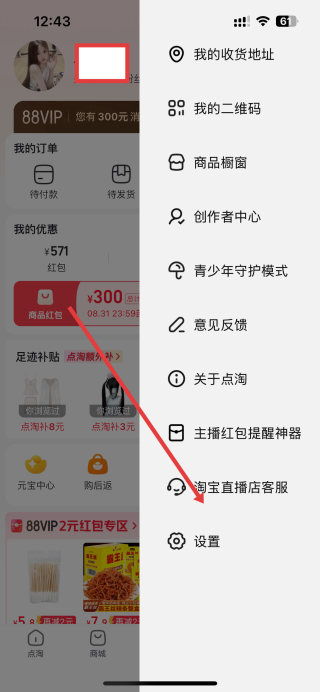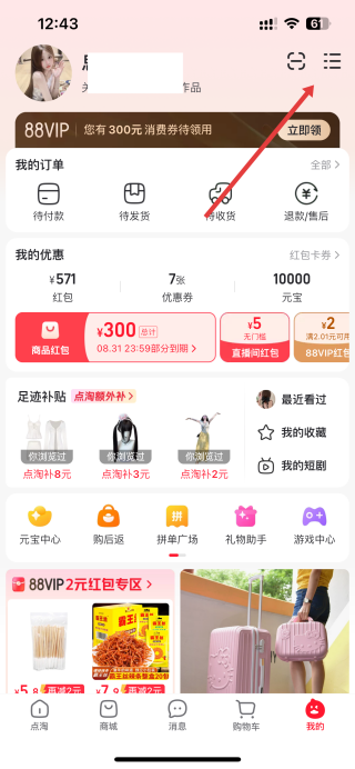 1、進(jìn)入點淘app點擊底部導(dǎo)航欄中我的,頁面右上角找到菜單圖標(biāo)并點擊,進(jìn)入隱藏菜單界面。