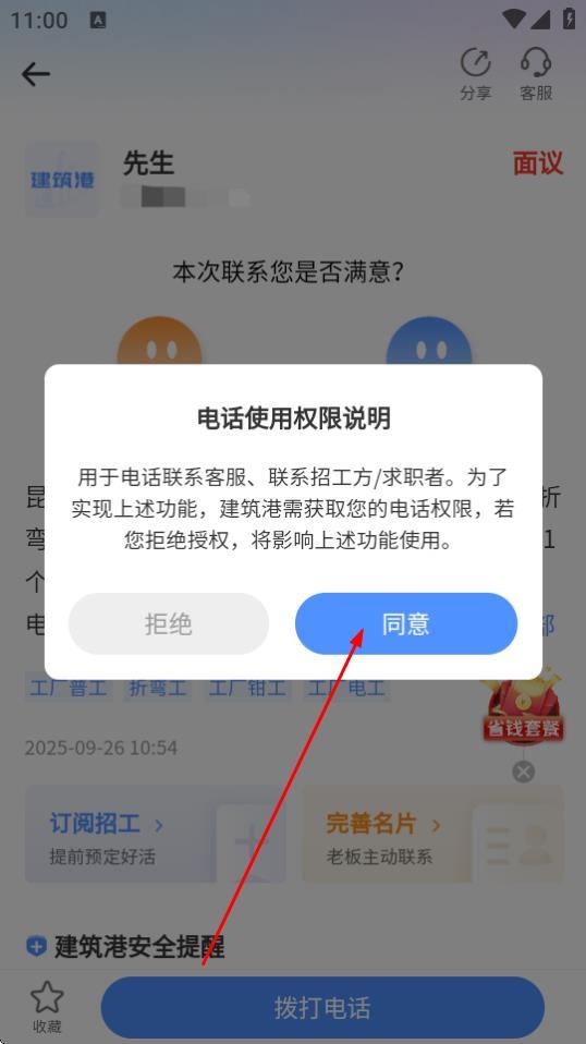 4、完成電話權(quán)限授權(quán)后,即可獲取完整的招工方電話號(hào)碼。